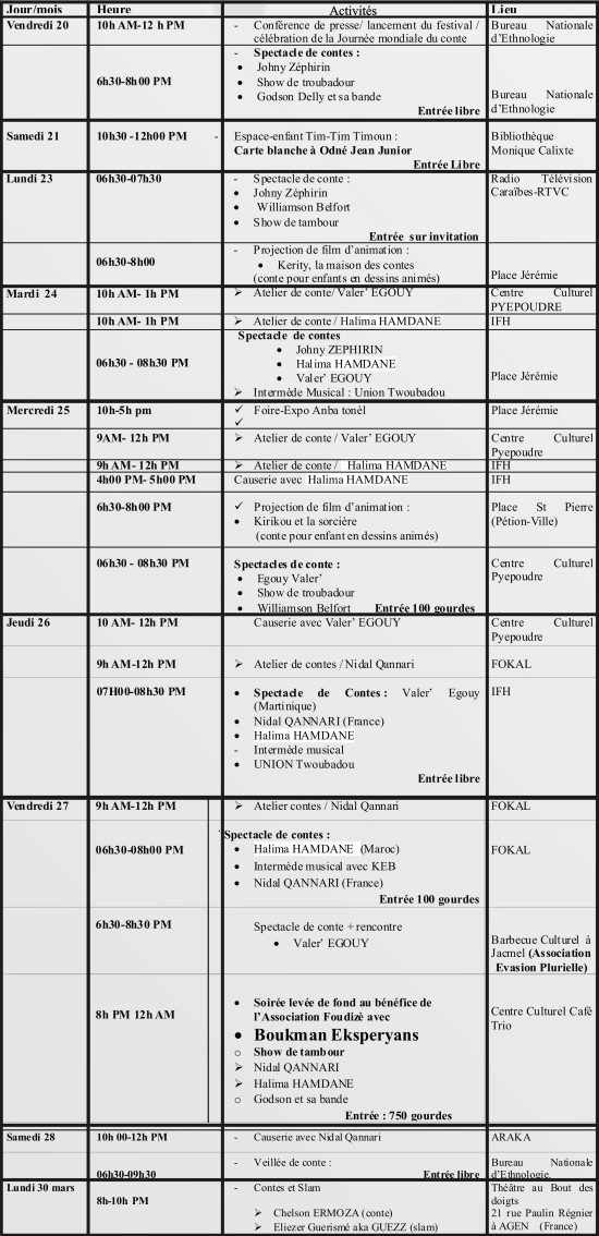 La direction du festival informe le public, que la 6ème édition du Festival interculturel de contes «Kont anba tonèl» se déroulera du 20 au 28 mars sur les scènes de la Fondation Connaissance et Liberté (FOKAL) (143, ave Christophe, Port-au-Prince) et du Centre culturel Pyepoudre (312, Route de Bourdon, Port-au-Prince). autour du thème « Raconter pour donner chair à nos rêves » Dans l’objectif de supporter l’Association Foudizè Théâtre, certaines activités seront payantes. Les t-shirts du festival seront en vente et la soirée de clôture sera une levée de fond au bénéfice de l’Association Foudizè Théâtre. Il y aura également d’autres activités, entre autres : des ateliers de deux jours sur le conte, animés par des artistes invités de France, de la Martinique et du Maroc. Des passes (avec réduction) seront disponibles pour ceux ou celles qui souhaitent en acheter pour les trois soirées. Programme des activités :