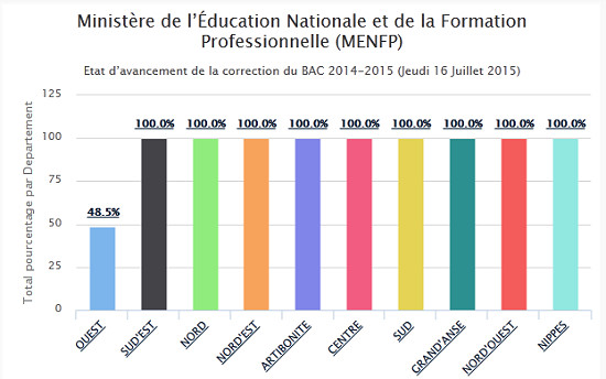 Joseph Job Maurice, le Directeur de l’Enseignement Secondaire (DES) annonce que la correction des épreuves du baccalauréat (Philo) [29 juin au 3 juillet 2015] progresse rapidement. Les copies des élèves sont déjà entièrement corrigées dans 9 départements sur 10. Seul reste à compléter le département de l’Ouest dont seulement 48.49% des copies sont corrigées. État d'avancement de la correction pour le département de l'Ouest : Anglais 44.2%, Chimie 53.6%, Espagnol 37.9%, Philosphie 63.5%, mathématiques 29%, physique 36.2%, biologie 50.4% et 60.75%. Rappelons qu’en décembre dernier, le Ministère de l’Éducation Nationale via la DES, avait organisé à l’attention de plusieurs centaines de correcteurs un séminaire de formation, sur la docimologie, l’évaluation, l’éthique et le protocole de l’évaluation.