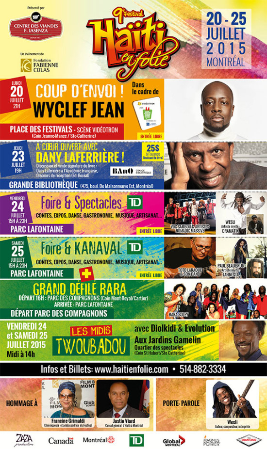 Au programme de ce Festival du 20 au 25 juillet : carnaval, défilé Rara dans la rue, artisanat, musique, littérature, danse et gastronomie. Le tout offert gratuitement pour faire mieux connaître la culture haïtienne. Seule une discussion à cœur ouvert, animée par l’écrivain québécois d’origine haïtienne Dany Laferrière autour de son livre « Dany Laferrière à l’Académie Française, Discours de réception et réponse d’Amin Maalouf » le 23 juillet prochain vous coûtera quelques dollars (25$).