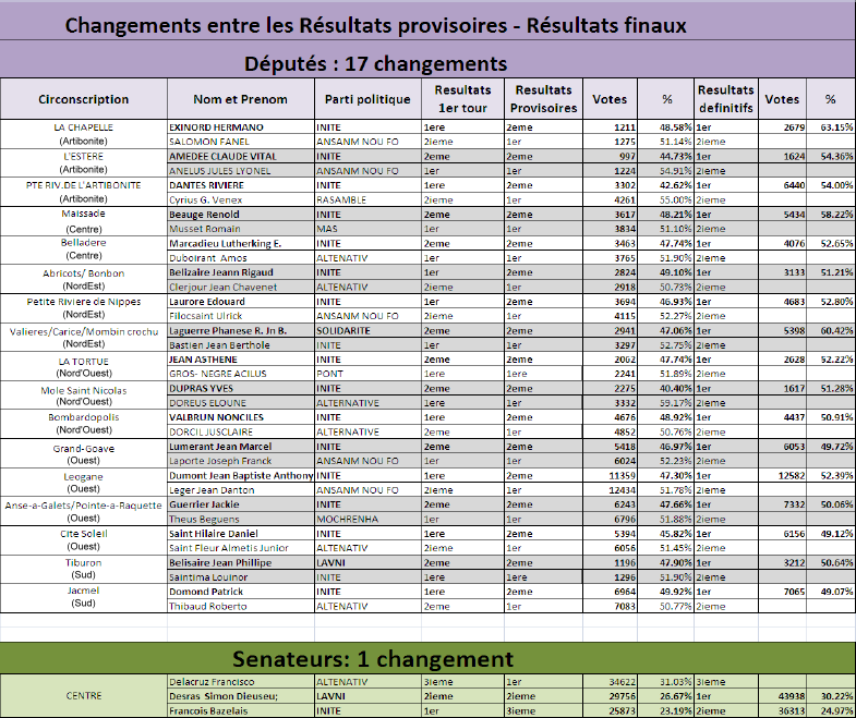 Les Etats-Unis partagent la préoccupation exprimée par la Mission Conjointe OEA-CARICOM d'Observation Electorale (MOEC), en ce qui a trait aux rapports et allégations de fraudes autour des résultats définitifs du second tour des élections législatives du 20 mars publiés par le Conseil Electoral Provisoire (CEP), suite au processus de contestation. Correction Ambassade des États Unis - 23 Avril 2011 Après avoir réexaminé les résultats et les matériels fournis par le CEP, les Nations unies et les observateurs internationaux, nous n'avons trouvé aucune explication quant au revirement observé dans les résultats définitifs pour 18 cas des législatives, et lesquels cas, à l’exception de deux, profitent au parti au pouvoir. Ces revirements incluent, parmi d’autres, le cas d’un candidat du parti Lavni qui avait été placé en deuxième position selon les résultats préliminaires annoncés, et qui aujourd’hui remporte la première place suivant les résultats définitifs du CEP. Le nombre de suffrages exprimés dans cette élection affiche une augmentation de plus de 33.000 voix, passant de 111.575 suivant les résultats préliminaires à plus de 145.000 selon les résultats définitifs du CEP. Deux autres candidats du parti au pouvoir s’étaient placés en deuxième position suivant les résultats préliminaires, et les résultats définitifs du CEP montrent que le total des suffrages exprimés en leur faveur est le double de ce qu’ils avaient obtenu selon les résultats préliminaires. Pour l’un d’entre eux, les résultats définitifs montrent également qu’il a recueilli plus de voix que le total des suffrages enregistrés dans toute sa circonscription.