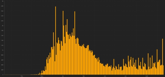 SITUATION MONDIALE : Jeudi 10 septembre 2020, le nombre de personnes contaminées dans le monde par le coronavirus Covid-19 depuis le début de la pandémie (Source officielle), s’élève à 27,891,274 cas confirmés (+285,714 en 24h), la veille (+255,867). Nombre de pays contaminés 188 (inchangé) Bulletin de la veille : https://www.haitilibre.com/article-31759-haiti-diaspora-covid-19-bulletin-quotidien-9-septembre-2020.html Depuis le début de la pandémie 18,795,830 personnes (+230,758 en 24h) ont été guéries du Covid-19 dans le monde, la veille (+216,019) Depuis le début de la pandémie 904,333 personnes sont mortes du Covid-19 dans le monde (+6,064 en 24h), la veille (+5,389) Le nombre de cas actifs dans le monde (excluant les décès et les guérisons) est actuellement de 8,191,111 cas (+48,892 en 24h), la veille (+31,459) Taux moyen de guérison au monde : 67.39% (+) Taux moyen de mortalité au monde : 3.24% (-) TOP 5 des pays ayant le plus de cas actifs : 1er - USA : 3,784,089 cas (+4,829 en 24h), la veille (+705) 2e - Inde : 919,018 cas (+21,624 en 24h), la veille (+13,697) 3e - Brésil : 457,718 cas (-4,470 en 24h), la veille (-9,445) 4e - Espagne : 363,375 (+8,832 en 24h), précédent (+8,886) 5e - Royaume-Unis : 314,099 cas (+2,669 en 24h), la veille (+2,446) TOP 5 des pays ayant le plus de décès : 1er - USA : 190,872 décès (+1,192 en 24h), la veille (+465) 2e - Brésil :128,539 décès (+1,075 en 24h), la veille (+504) 3e - Inde : 75,062 décès (+1,172 en 24h), la veille (+1,115) 4e - Mexico : 69,049 décès (+565 en 24h), la veille (+703) 5e - Royaume-Unis 41,683 décès (+8 en 24h), la veille (+32) TOP 5 des pays ayant le plus grand nombre total de guérisons : 1er - Brésil : 3,611,632 (+39,211 en 24h), taux de guérison 85.03% (-) 2e - Inde : 3,471,783 (+72,939 en 24h), taux de guérison 77.74% (-) 3e - USA : 2,387,479 personnes (+28,368 en 24h) taux de guérison 37.52% (+) 4e - Russie : 859,961 (+5,892 en 24h), taux de guérison 82.46% (+) 5e - Afrique du Sud : 569,935 (+2,206 en 24h), taux de guérison 88.72% (+) DIASPORA : USA : Cas depuis le début de l’épidémie : 6,362,440 cas (+34,389 en 24h), la veille (+26,730) Guérisons : 2,387,479 personnes (+28,368 en 24h), la veille (+25,560) Taux national de Guérison : 37.52% (+) Décès : 190,872 décès (+1,192 en 24h), la veille (+465) Cas actifs (moins décès et guérisons) : 3,784,089 cas (+4,829 en 24h), la veille (+705) Canada : Cas depuis le début de l’épidémie : 136,135 cas (+378 en 24h ), la veille (+1,462) Guérisons : 119,789 personnes (+369 en 24h), la veille (+1,034) Taux national de Guérison : 87.99% (+) Décès : 9,204 décès (+1 en 24h), la veille (+7) Taux national de mortalité : 6,76% (-) Cas actifs : (excluant décès et guérisons) 7,142 cas (+8 en 24h), la veille (+421) Canada : Nombre de cas confirmés quotidiens En phase de déconfinement, le Covid reste actif et le Canada enregistre plusieurs pics ponctuels de 24h. Toutefois, le nombre de nouveaux cas reste dans une amplitude qui ne permet pas d’affirmer pour le moment que le Canada s’en va vers une tendance à la hausse. France : Cas confirmés depuis le premier cas : 377,860 (+8,577 en 24h), précédent (+6,544) Guérisons : 88,494 personnes (+298 en 24h), la veille (+390) Taux national de Guérison : 23.42% (+) Décès : 30,810 décès (+30 en 24h), la veille (+39) Cas actifs : (excluant décès et guérisons) 259,186 (+8,879 en 24h), La veille (+6,115) Amérique latine et Caraïbe cas actifs : Brésil : 457,718 cas (-4,470 en 24h), la veille (-9,445) Pérou : 129,108 cas (-2,740 en 24h), la veille (-6,040) Argentine : 119,145 (-3,894 en 24h), la veille (+2,549 ) Colombie : 111,913 (-4,269 en 24h), la veille (-4,772 ) Mexique : 39,758 cas (+523 en 24h), la veille (+841) Panama : 25,507 (-42 en 24h), la veille (+317) République Dominicaine : 24,718 cas (+271 en 24h), la veille (-359) Chili : 15,770 cas (-359 en 24h), précédent (-776) Équateur : 10,223 cas (+1,335 en 24h), la veille (+614 ) Guyane française : 7,741 cas (+15 en 24h), la veille (+24) Haïti : 2,179 (+8), précédent (-44) Jamaïque : 2,380 cas (+85), la veille (+120) Bahamas : 1,475 cas (-31 en 48h), précédent (-6) Guadeloupe : 2,128 cas (+82 en 24h), la veille (-11) Martinique : 811 cas (inchangé en 24h), précédent (+179) Cuba : 628 (+55 en 24h), la veille (-35) HAÏTI : Situation épidémiologique : Selon le Ministère de la Santé Publique, 7 nouveaux cas de Covid-19 auraient été confirmés en Haïti en date du 7 septembre 2020 (dernières données disponibles) pour un total de 8,384 cas sur l’ensemble du territoire national depuis le premier cas (19 mars 2020 https://www.haitilibre.com/article-30319-haiti-sante-origine-des-2-premiers-cas-de-covid-19-en-haiti.html ). Décès : (inchangé). Total national de 214 décès. Guérisons : : (Inchangé) 5,991 personnes Taux de guérison : 71.46% (+) Cas actifs : (moins décès et guérisons) 2,179 Cas importés : 152 cas depuis la réouverture des aéroports et +43 depuis le dernier bilan datant du 9 juillet (109) https://www.haitilibre.com/article-31348-haiti-flash-152-cas-importes-depuis-la-reouverture-des-aeroports.html (Depuis, ces informations ne sont plus rendues disponibles) Cas suspects investigués depuis le 19 mars : 25,059 Cas testés depuis le début de la pandémie : 24,862 (en date du 7 septembre, dernier chiffre disponible) Personnes hospitalisées actuellement : (information non disponible) Personnes en soins intensifs actuellement : (information non disponible) Personnes traitées à domicile actuellement : (information non disponible) Cas confirmés par département : Ouest : 5,738 cas Artibonite : 493 cas Nord : 479 cas Centre : 439 cas Sud-Est : 260 cas Nord-Est : 244 cas Sud : 230 cas Nord-Ouest :198 cas Grand’Anse : 162 Nippes : 141 Localisation des cas : Ouest : 5,738 cas Delmas : 1,392 cas Port-au-Prince : 1,141 cas Pétion-ville : 868 cas Tabarre : 687 cas Croix-des-B