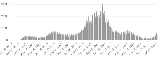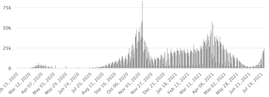 Vaccination : 341,04 millions de doses de vaccin injectées depuis le 14 décembre 2020 date de la première injection aux États-Unis (680,000 doses injectées, en 24h). Mise à jour 24 juillet 2021 dernières données disponibles).