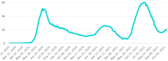 Cas testés depuis le début de la pandémie : 125,082 cas (+361 en 24h) mise à jour 7 octobre 2021 dernières données disponibles. Notez que le très faible nombre de personnes testées ne permet pas statistiquement de faire une estimation représentative des cas actifs de Covid-19 en Haïti. Ce qui explique également le faible nombre de cas détecté quotidiennement. À titre de comparaison la République voisine a réalisé plus de 2,1millions de tests sur sa population depuis le début de l’épidémie. TOP 5 des Communes les plus touchées dans l’Ouest (2021) : Delmas : 2,160 (+7) ; Pétion ville 1,772 (+1) ; Port-au-Prince 1,177 (+6) ; Croix-des-Bouquets 954 (+6) ; Tabarre 939 (+5). Cas confirmés par département (2021) : Ouest : 8,169 cas (2020 : 6,945 cas) Nord : 550 cas (2020 : 677 cas) Centre : 755 cas (2020 : 508 cas) Artibonite : 640 cas (2020 : 593 cas) Nord-Est : 310 cas (2020 : 314 cas) Sud-Est : 457 cas (2020 : 274 cas) Sud : 628 cas (2020 : 262 cas) Nord-Ouest : 300 cas (2020 : 229 cas) Grand'Anse : 604 cas (2020 : 176 cas) Nippes : 191 cas (2020 : 149 cas) Décès cumulés par département (2021) : Ouest : 212 décès (2020 : 104 décès) Nord : 43 décès (2020 : 34 décès) Centre : 31 décès (2020 : 13 décès) Artibonite : 25 décès (2020 : 39 décès) Nord-Est : 8 décès (2020 : 6 décès) Sud : 37 décès (2020 : 6 décès) Sud-Est : 11 décès (2020 : 9 décès) Nord-Ouest : 12 décès (2020 : 12 décès) Grand'Anse : 5 décès (2020 : 13 décès) Nippes : 22 décès (2020 : 5 décès) Répartition des décès par âge (depuis le début de l’épidémie) : 0-9 ans : 13 décès 10-19 ans : 6 décès 20-29 ans : 25 décès 30-39 ans : 40 décès 40-49 ans : 67 décès 50-59 ans : 108 décès 60-69 ans : 147 décès (+1) 70-79 ans : 142 décès (+1) 80 ans et plus : 101 décès Vaccination : 95,732 (+7,940 en 3 jours) doses de vaccin « Spikevax » (appellation officielle) du Laboratoire MODERNA ont été injectées au total en Haïti depuis le 16 juillet 2021, date de la première injection. 26,694 personnes sont entièrement vaccinées (2 doses). Mise à jour 10 octobre 2021, dernières données disponibles. Liste des 128 Centres de vaccination ouverts en Haïti (et horaires) par département : (mise à jour 11 octobre 2021) DIASPORA : Situation épidémiologique : USA : *Cas depuis le premier cas (9 mars 2020) : 45,547,920 cas (+116,753 en 24h), la veille (+117,814) *Guérisons : 35,107,452 guérisons (+109,484 en 24h), la veille (+200,803) Taux national de Guérison : 77,07% (+) *Décès : 739,778 décès (+2,189 en 24h), la veille (+2,978) Taux national de mortalité : 1,62% (=) *Cas actifs (moins décès et guérisons) : 9,700,690 cas (+5,080), la veille (-85,967) *Tests : 664,075,307 personnes testées depuis le premier cas USA : Nombre de cas confirmés quotidiens :
