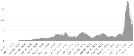 (Jour-1) Vaccination : 550,79 millions de doses de vaccin injectées depuis le 14 décembre 2020 date de la première injection aux États-Unis (+230,000 doses en 24h). Mise à jour 22 février 2022 (dernières données disponibles). RÉPUBLIQUE DOMINICAINE : Cas confirmés depuis le 1er mars 2020 : 572,290 cas (+434 en 24h) la veille (+304). Premier cas (1er mars 2020) Guérisons : 565,641 guérisons (+415), la veille (+405) Taux national de Guérison : 98,83% (-) Décès : 4,357 décès (+0 en 24h), la veille (+0) Taux de mortalité : 0,76% (=) Taux de positivité sur 4 semaines épidémiologiques : 6,9% (-) Cas actifs : (excluant décès et guérisons) 2,292 cas (+19 en 24h) la veille (-101) République Dominicaine : Tendance cas actifs : (moins guérisons et décès)