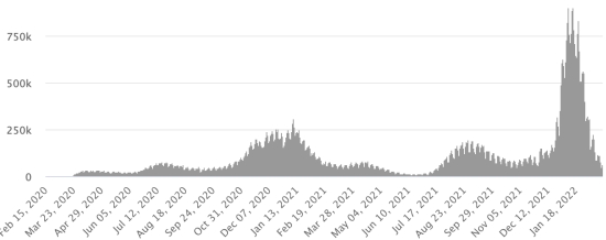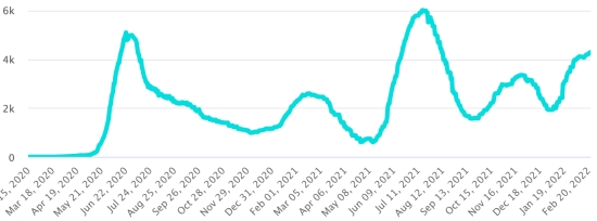 (Jour-1) Vaccination : 551,27 millions de doses de vaccin injectées depuis le 14 décembre 2020 date de la première injection aux États-Unis (+480,000 doses en 24h). Mise à jour 23 février 2022 (dernières données disponibles). RÉPUBLIQUE DOMINICAINE : Cas confirmés depuis le 1er mars 2020 : 572,596 cas (+306 en 24h) la veille (+434). Premier cas (1er mars 2020) Guérisons : 566,088 guérisons (+447), la veille (+415) Taux national de Guérison : 98,86% (+) Décès : 4,360 décès (+3 en 48h), la veille (+0) Taux de mortalité : 0,76% (=) Taux de positivité sur 4 semaines épidémiologiques : 7,0% (+) Cas actifs : (excluant décès et guérisons) 2,148 cas (-144 en 24h) la veille (+19) République Dominicaine : Tendance cas actifs : (moins guérisons et décès)