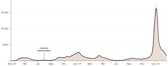 Test : 16,600,856 personnes testées depuis le premier cas (+15,893 en 24h) Vaccination : 18,341,739 doses de vaccin injectées depuis le 14 décembre 2020 date de la première injection (+15,030 doses en 24h), dernières données disponibles - MSSS en date du 21 février 2022) FRANCE : *Cas confirmés depuis le premier cas (24 janvier 2020) : 22,401,406 cas (+97,382 cas en 24h), précédent (+ 17,195) *Guérisons : 19,735,713 guérisons (+310,749 en 24h), précédent (+420,828) Taux national de Guérison : 88,10% (+) Décès : 137,276 décès (+603 en 48h), précédent (non disponible) Taux de mortalité : 0,61% (=) Cas Actifs : 2,528,417 (-217,981 en 24h), précédent (-399,701) Test : 243,529,298 (dernière donnée disponible 17 février 2022) France : Tendance cas actifs : (moins guérisons et décès)