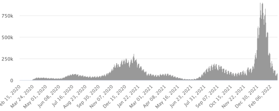 Test : 16,658,680 personnes testées depuis le premier cas (+18.485 en 24h) Vaccination : 18,382,262 doses de vaccin injectées depuis le 14 décembre 2020 date de la première injection (+14,825 doses en 24h), dernières données disponibles - MSSS en date du 25 février 2022) FRANCE : *Cas confirmés depuis le premier cas (24 janvier 2020) : 22,593,109 cas (+58,138 cas en 24h), précédent (+ 66,732) *Guérisons : 20,464,974 guérisons (+214,354 en 24h), précédent (+240,768) Taux national de Guérison : 90,58% (+) Décès : 137,958 décès (+188 en 24h), précédent (+281) Taux de mortalité : 0,61% (=) Cas Actifs : 2,146,581 (-156,404 en 24h), précédent (-174,317) Test : 243,529,298 (dernière donnée disponible 17 février 2022) France : Nombre de cas confirmés quotidiens :