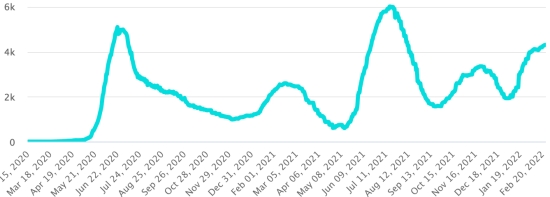 (Jour-1) Vaccination : 552,83 millions de doses de vaccin injectées depuis le 14 décembre 2020 date de la première injection aux États-Unis (+400,000 doses en 24h). Mise à jour 27 février 2022 (dernières données disponibles). RÉPUBLIQUE DOMINICAINE : Cas confirmés depuis le 1er mars 2020 : 574,071 cas (+295 en 24h) la veille (+318). Premier cas (1er mars 2020) Guérisons : 568,031 guérisons (+282), la veille (+522) Taux national de Guérison : 98,94% (=) Décès : 4,368 décès (+3 en 24h), la veille (+2) Taux de mortalité : 0,76% (=) Taux de positivité sur 4 semaines épidémiologiques : 5,76% (-) Cas actifs : (excluant décès et guérisons) 1,672 cas (+10 en 24h) la veille (-206) République Dominicaine : Tendance cas actifs : (moins guérisons et décès)