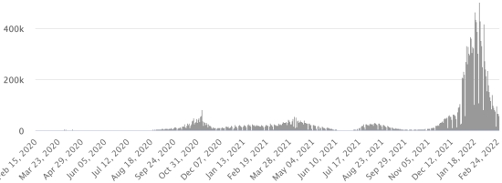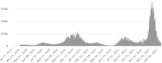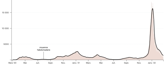 Test : 16,658,680 personnes testées depuis le premier cas (+18.485 en 24h) Vaccination : 18,382,262 doses de vaccin injectées depuis le 14 décembre 2020 date de la première injection (+14,825 doses en 24h), dernières données disponibles - MSSS en date du 25 février 2022) FRANCE : *Cas confirmés depuis le premier cas (24 janvier 2020) : 22,646,732 cas (+53,623 cas en 24h), précédent (+58,138) *Guérisons : 20,620,312 guérisons (+155,338 en 24h), précédent (+214,354) Taux national de Guérison : 91,05% (+) Décès : 138,059 décès (+101 en 24h), précédent (+188) Taux de mortalité : 0,60% (-) Cas Actifs : 1,888,361 (-101,614 en 24h), précédent (-156,404) Test : 243,529,298 (dernière donnée disponible 17 février 2022) France : Nombre de cas confirmés quotidiens :
