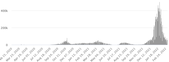 (Jour-1) Vaccination : 10,90 millards de doses de vaccin injectées (+20 millions de doses injectées en 24h. Mise à jour 4 mars 2022 (dernières données disponibles). HAÏTI : Situation épidémiologique : Selon le Ministère de la Santé Publique, +32 nouveaux cas de Covid-19 et de ses variants auraient été confirmés en Haïti en date du 1er mars 2022 (dernières données partielles disponibles) pour un total de 30,382 cas confirmés sur l’ensemble du territoire national (48,7% de femmes et 51,3% hommes), depuis le premier cas (19 mars 2020 https://www.haitilibre.com/article-30319-haiti-sante-origine-des-2-premiers-cas-de-covid-19-en-haiti.html ). Précédente mise à jour (+14 cas le 26 février 2022). Guérisons : 25,485 (+255) Taux de guérison : 83,88% (+) Décès : 820 décès (+0) Taux de mortalité : 2,69% (-) 5ème vague (Omicron dominant) : Total de la 5ème vague (début 27 décembre 2021) s’élève à 4,387 cas confirmés et 54 décès Haïti : Tendance cas actifs : (moins guérisons et décès)