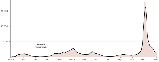 (tendance moyenne hebdomadaire) Test : 16,764,228 personnes testées depuis le premier cas (+30,656 en 48h) Vaccination : 18,456,842 doses de vaccin injectées depuis le 14 décembre 2020 date de la première injection (+8,739 doses en 48h), dernières données disponibles - MSSS en date du 4 mars 2022) FRANCE : *Cas confirmés depuis le premier cas (24 janvier 2020) : 22,958,320 cas (+57,789 cas en 24h), précédent (+60,225) *Guérisons : 21,483,142 guérisons (+118,843 en 24h), précédent (+131,196) Taux national de Guérison : 93,57% (+) Décès : 139,123 décès (+181 en 24h), précédent (+180) Taux de mortalité : 0,60% (=) Cas Actifs : 1,336,055 (-60,822 en 24h), précédent (-71,151) Test : 246,629,975 (dernière donnée disponible 27 février 2022) France : Nombre de cas confirmés quotidiens :