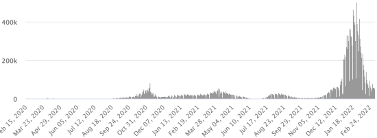 (tendance moyenne hebdomadaire) Test : 16,764,228 personnes testées depuis le premier cas (+30,656 en 48h) Vaccination : 18,456,842 doses de vaccin injectées depuis le 14 décembre 2020 date de la première injection (+8,739 doses en 48h), dernières données disponibles - MSSS en date du 4 mars 2022) FRANCE : *Cas confirmés depuis le premier cas (24 janvier 2020) : 23,057,326 cas (+45,328 cas en 24h), précédent (+53,678) *Guérisons : 21,596,027 guérisons (+26,443 en 24h), précédent (+86,442) Taux national de Guérison : 93,54% (+) Décès : 139,275 décès (+32 en 24h), précédent (+120) Taux de mortalité : 0,60% (=) Cas Actifs : 1,322,024 (+18,853 en 24h), précédent (-32,884) Test : 246,629,975 (dernière donnée disponible 27 février 2022) France : Nombre de cas confirmés quotidiens :