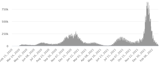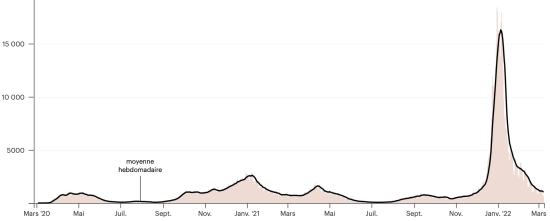 (tendance moyenne hebdomadaire) Test : 16,810,265 personnes testées depuis le premier cas (+10,551 en 24h) Vaccination : 18,485,915 doses de vaccin injectées depuis le 14 décembre 2020 date de la première injection (+4,679 doses en 24h), dernières données disponibles - MSSS en date du 8 mars 2022) FRANCE : *Cas confirmés depuis le premier cas (24 janvier 2020) : 23,164,872 cas (+93,050 cas en 24h), précédent (+14,496) *Guérisons : 21,836,672 guérisons (+98,568 en 24h), précédent (+142,077) Taux national de Guérison : 94,26% (+) Décès : 139,618 décès (+167 en 24h), précédent (+176) Taux de mortalité : 0,60% (=) Cas Actifs : 1,188,582 (-5,685 en 24h), précédent (+127,757) Test : 246,629,975 (dernière donnée disponible 27 février 2022) France : Nombre de cas confirmés quotidiens :
