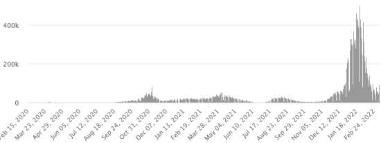 (Jour-1) Vaccination : 10,96 millards de doses de vaccin injectées (+10 millions de doses injectées en 24h. Mise à jour 9 mars 2022 (dernières données disponibles). HAÏTI : Situation épidémiologique : Avertissement : Le Ministère de la Santé Publique et de la Population (MSPP) n’as pas rendu disponible après le 5 mars 2022 les données quotidiennes sur la situation du Covid-19 en Haïti. En conséquence, les données ci-dessous sur la situation en Haïti sont les dernières disponibles. Selon le Ministère de la Santé Publique, +30 nouveaux cas de Covid-19 et de ses variants auraient été confirmés en Haïti en date du 5 mars 2022 (dernières données partielles disponibles) pour un total de 30,430 cas confirmés sur l’ensemble du territoire national (48,7% de femmes et 51,3% hommes), depuis le premier cas (19 mars 2020 https://www.haitilibre.com/article-30319-haiti-sante-origine-des-2-premiers-cas-de-covid-19-en-haiti.html ). Précédente mise à jour (+18 cas en date du 3 mars 2022). Guérisons : 25,729 (+244) Taux de guérison : 84,55% (+) Décès : 827 décès (+2) (Centre +1, Nord +1) Taux de mortalité : 2,71% (=) 5ème vague (Omicron dominant) : Total de la 5ème vague (début 27 décembre 2021) s’élève à 4,435 cas confirmés et 61 décès Haïti : Tendance cas actifs : (moins guérisons et décès)