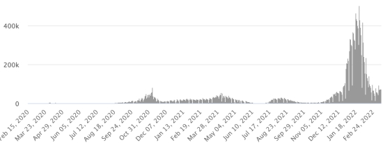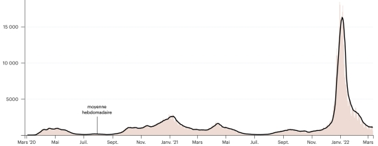 (tendance moyenne hebdomadaire) Test : 16,850,668 personnes testées depuis le premier cas (+13,992 en 24h) Vaccination : 18,505,552 doses de vaccin injectées depuis le 14 décembre 2020 date de la première injection (+7,894 doses en 24h), dernières données disponibles - MSSS en date du 12 mars 2022) FRANCE : *Cas confirmés depuis le premier cas (24 janvier 2020) : 23,514,144 cas (+60,422 cas en 24h), précédent (+72,443) *Guérisons : 22,261,297 guérisons (+114,548 en 24h), précédent (+58,952) Taux national de Guérison : 94,18% (-) Décès : 140,109 décès (+29 en 24h), précédent (+51) Taux de mortalité : 0,59% (=) Cas Actifs : 1,112,738 (-54,155 en 24h), précédent (+13,440) Test : 246,629,975 (dernière donnée disponible 27 février 2022) France : Nombre de cas confirmés quotidiens :