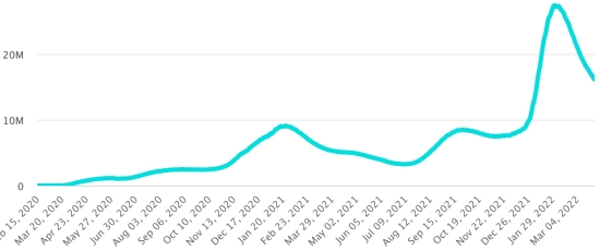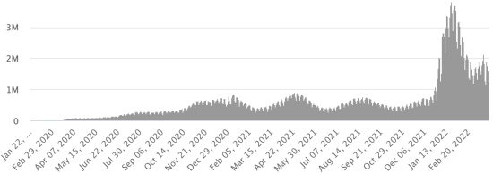 SITUATION MONDIALE 2019-2022 : Situation épidémiologique : Lundi 28 mars 2022 le nombre de personnes contaminées dans le monde par le coronavirus Covid-19 et ses variants depuis le début de la pandémie (11 mars 2020) s’élève à 482,187,023 cas (+881,743 en 24h), la veille (+1,222,445) Nombre de pays contaminés : 225 *Guérisons : 416,615,028 personnes ont été guéries du Covid-19 dans le monde (+1,088,686), la veille (+1,033,207) *Décès : 6,148,517 personnes sont mortes du Covid-19 dans le monde depuis le début de la pandémie (+2,122 en 24h), la veille (+2,769) *Cas actifs (moins décès et guérisons) dans le monde est actuellement de 59,423,478 cas (-209,065 en 24h), la veille (+186,469) Taux moyen de guérison au monde : 86,40% (+) Taux moyen de mortalité au monde : 1,27% (=) Monde : Nombre de cas confirmés quotidiens :