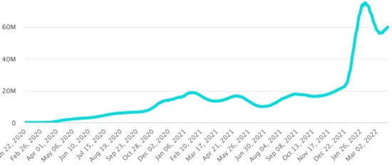 (Jour-1) Vaccination : 11,26 millards de doses de vaccin injectées (+20 millions de doses injectées en 24h. Mise à jour 28 mars 2022 (dernières données disponibles). HAÏTI : Avertissement : Le Ministère de la Santé Publique et de la Population (MSPP) n’as pas rendu disponible après le 22 mars 2022 les données quotidiennes sur la situation du Covid-19 en Haïti. En conséquence, les données ci-dessous sur la situation en Haïti sont les dernières disponibles. Selon le Ministère de la Santé Publique, +13 nouveaux cas de Covid-19 et de ses variants auraient été confirmés en Haïti en date du 22 mars 2022 (dernières données partielles disponibles) pour un total de 30,522 cas confirmés sur l’ensemble du territoire national (48,7% de femmes et 51,3% hommes), depuis le premier cas (19 mars 2020 https://www.haitilibre.com/article-30319-haiti-sante-origine-des-2-premiers-cas-de-covid-19-en-haiti.html ). Précédente mise à jour (+15 cas en date du 18 mars 2022). Guérisons : 27,960 (+468) Taux de guérison : 91,60% (+) Décès : 833 décès (+6) (Ouest +2, Centre +1, Sud-Est+1, Artibonite +2) Taux de mortalité : 2,72% (+) 5ème vague (Omicron dominant) : Total de la 5ème vague (début 27 décembre 2021) 4,528 cas confirmés et 67 décès Haïti : Tendance cas actifs : (moins guérisons et décès)