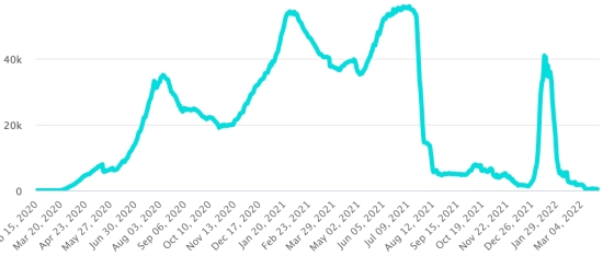 (Jour-1) Vaccination : 560,13 millions de doses de vaccin injectées depuis le 14 décembre 2020 date de la première injection aux États-Unis (+160,000 doses en 24h). Mise à jour 28 mars 2022 (dernières données disponibles). RÉPUBLIQUE DOMINICAINE : Cas confirmés depuis le 1er mars 2020 : 577,880 cas (+39 en 24h) la veille (+100 en 24h). Premier cas (1er mars 2020) Guérisons : 573,254 guérisons (+48 en 24h), la veille (+165) Taux national de Guérison : 99,19% (-) Décès : 4,375 décès (+0), précédent (+0) Taux de mortalité : 0,75% (=) Taux de positivité sur 4 semaines épidémiologiques : 1,12% (+) Cas actifs : (excluant décès et guérisons) 251 cas (-13 en 24h) la veille (+35) République Dominicaine : Tendance cas actifs : (moins guérisons et décès)