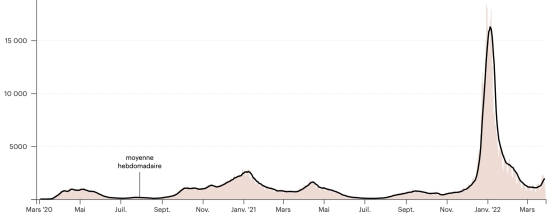 (Jour-1) TOP 5 des Provinces ayant le plus de nouveaux cas les dernières 24h : La Altagracia : +23 nouveaux cas en 24h () Santiago : +12 nouveaux cas en 24h (+) Maria Trinidad Sánchez : +2 nouveaux cas en 24h () Santo Domingo : +1 nouveaux cas en 24h (-) Peravia : + 1 nouveaux cas en 24h () Vaccination : 15,48 millions de doses de vaccin injectées depuis le 16 février 2021, date de la première injection en République Dominicaine (+10,000 doses injectées en 24h). Mise à jour 27 mars 2022 (dernières données disponibles). QUÉBEC : Cas confirmés depuis le premier cas (27 février 2020) : 959,212 (+5,714 en 72h), précédent (+2,203 en 24h Guérisons : 926,395 personnes (+3,997 en 72h) précédent (+1,458 en 24h) Taux de guérison : 96,57% (-) Décès : 14,325 (+25 en 72h) précédent (+12 en 24h) Taux de mortalité : 1,49% (=) Cas actifs : (excluant décès et guérison) 18,492 cas (+1,692 en 72h), précédent (+733 en 24h) Québec : Tendance cas quotidien confirmés :