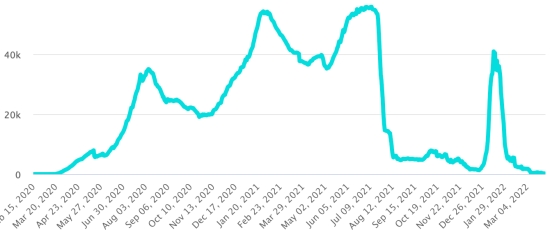 (Jour-1) Vaccination : 560,67 millions de doses de vaccin injectées depuis le 14 décembre 2020 date de la première injection aux États-Unis (+230,000 doses en 24h). Mise à jour 30 mars 2022 (dernières données disponibles). RÉPUBLIQUE DOMINICAINE : Cas confirmés depuis le 1er mars 2020 : 578,020 cas (+38 en 24h) la veille (+72 en 24h). Premier cas (1er mars 2020) Guérisons : 573,445 guérisons (+76 en 24h), la veille (+22) Taux national de Guérison : 99,20% (=) Décès : 4,375 décès (+0), précédent (+0) Taux de mortalité : 0,75% (=) Taux de positivité sur 4 semaines épidémiologiques : 0,92% (-) Cas actifs : (excluant décès et guérisons) 200 cas (-38 en 24h) la veille (+50) République Dominicaine : Tendance cas actifs : (moins guérisons et décès)
