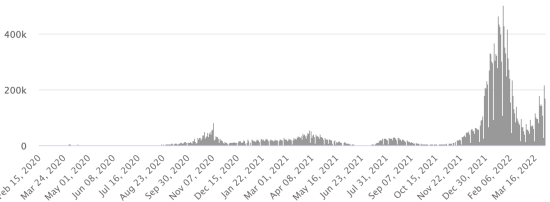 (Jour-1) Vaccination : 11,32 millards de doses de vaccin injectées (+10 millions de doses injectées en 24h. Mise à jour 31 mars 2022 (dernières données disponibles). HAÏTI : Avertissement : Le Ministère de la Santé Publique et de la Population (MSPP) n’as pas rendu disponible après le 26 mars 2022 les données quotidiennes sur la situation du Covid-19 en Haïti. En conséquence, les données ci-dessous sur la situation en Haïti sont les dernières disponibles. Selon le Ministère de la Santé Publique, +16 nouveaux cas de Covid-19 et de ses variants auraient été confirmés en Haïti en date du 26 mars 2022 (dernières données partielles disponibles) pour un total de 30,545 cas confirmés sur l’ensemble du territoire national (48,7% de femmes et 51,3% hommes), depuis le premier cas (19 mars 2020 https://www.haitilibre.com/article-30319-haiti-sante-origine-des-2-premiers-cas-de-covid-19-en-haiti.html ). Précédente mise à jour (+7 cas en date du 24mars 2022). Guérisons : 28,431 (+162) Taux de guérison : 93,07% (+) Décès : 833 décès (+0) () Taux de mortalité : 2,72% (=) 5ème vague (Omicron dominant) : Total de la 5ème vague (début 27 décembre 2021) 4,551 cas confirmés et 67 décès Dépistage depuis le début de la pandémie : 188,012 tests (+690 en 2 jours) depuis le 19 mars 2020, dernières données disponibles. Notez que la très petite quantité de personnes dépistées chaque jour à l’échelon national sur une population estimé à 11,6 millions de citoyens, ne permet pas statistiquement de faire une estimation représentative de la situation en Haïti, ce qui se traduit par un nombre de cas confirmés quotidiennement largement sous évalué. TOP 5 des Communes les plus touchées dans l’Ouest (2022) : Delmas : 740 (+1) ; Pétion-ville 624 (+3) ; Port-au-Prince 406 (+0) ; Tabarre 287 (+0) ; Croix-des-Bouquets 239 (+1) Cas confirmés par département (2022 / 2021 / 2020) : Ouest : 2022 : 2,552 cas ; (2021 : 9,890) ; (2020 : 6,945 cas) Nord : 2022 : 267 cas ; (2021 : 664) ; (2020 : 677 cas) Centre : 2022 : 226 cas ; (2021 : 1,001) ; (2020 : 508 cas) Artibonite : 2022 : 184 cas ; (2021 : 855) ; (2020 : 593 cas) Nord-Est : 2022 : 148 cas ; (2021 : 404) ; (2020 : 314 cas) Sud-Est : 2022: 262 cas ; (2021 : 768) ; (2020 : 274 cas) Sud : 2022 : 214 cas ; (2021 : 891) ; (2020 : 262 cas) Nord-Ouest : 2022 : 255 cas ; (2021 : 383) ; (2020 : 229 cas) Grand'Anse : 2022 : 173 cas ; (2021 : 861) ; (2020 : 176 cas) Nippes : 2022 : 39 cas ; (2021 : 249) (2020 : 149 cas) Décès cumulés par département (2022-2021) : Ouest : 295 décès (2020 : 104 décès) Nord : 54 décès (2020 : 34 décès) Centre : 79 décès (2020 : 13 décès) Artibonite : 42 décès (2020 : 39 décès) Nord-Est : 7 décès (2020 : 6 décès) Sud : 51 décès (2020 : 6 décès) Sud-Est : 15 décès (2020 : 9 décès) Nord-Ouest : 15 décès (2020 : 12 décès) Grand'Anse : 7 décès (2020 : 13 décès) Nippes : 27 décès (2020 : 5 décès) Répartition des décès par âge (depuis le début de l’épidémie) : 0-9 ans : 15 décès 10-19 ans : 10 décès 20-29 ans : 31 décès 30-39 ans : 56 décès 40-49 ans : 80 décès 50-59 ans : 134 décès 60-69 ans : 187 décès 70-79 ans : 183 décès 80 ans et plus : 137 décès Vaccination : 163,369 haïtiens (1,4% de la population) +2,205 en 6 jours ont reçu une 1ère dose de vaccin depuis le 16 juillet 2021 date de la première injection à travers 149 centres de vaccinations ouverts et 111,914 haïtiens sont entièrement vaccinés (2 doses, 0,96% de la population) +1,585 en 6 jours. Mise à jour 22 mars 2022 dernières informations disponibles (source MSPP). Liste des 149 Centres de vaccination ouverts en Haïti (et horaires) par département : (mise à jour 20 octobre 2021, dernières informations disponibles) DIASPORA : Situation épidémiologique : USA : *Cas depuis le premier cas (29 février 2020) : 81,780,503 cas (+39,781 en 24h), la veille (+54,094) *Guérisons : 65,236,840 guérisons (+163,741), la veille (+196,125) Taux national de Guérison : 79,77% (+) *Décès : 1,007,320 décès (+875), la veille (+1,389) Taux national de mortalité : 1,23% (=) *Cas actifs (moins décès et guérisons) : 15,536,343 (-124,835), la veille (-143,420) USA : Nombre de cas confirmés quotidiens :