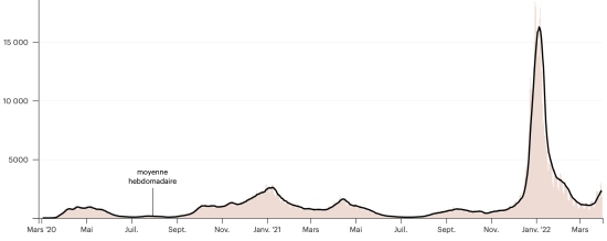 (tendance moyenne hebdomadaire) Vaccination : 18,648,742 doses de vaccin injectées depuis le 14 décembre 2020 date de la première injection (+17,145 doses en 24h), dernières données disponibles - MSSS en date du 31 mars 2022) FRANCE : *Cas confirmés depuis le premier cas (24 janvier 2020) : 25,614,843 cas (+169,311 cas en 24h), précédent (+169,024) *Guérisons : 23,239,145 guérisons (+72,250) Taux national de Guérison : 90,72% (-) Décès : 142,273 (+139 en 24h), précédent (+148) Taux de mortalité : 0,55% (=) Cas Actifs : 2,233,425 (+96,922), précédent (+94,057) France : Nombre de cas confirmés quotidiens