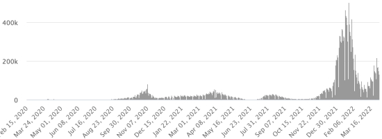 (Jour-1) Vaccination : 11,39 millards de doses de vaccin injectées (+20 millions de doses injectées en 24h. Mise à jour 3 avril 2022 (dernières données disponibles). HAÏTI : Avertissement : Le Ministère de la Santé Publique et de la Population (MSPP) n’as pas rendu disponible après le 26 mars 2022 les données quotidiennes sur la situation du Covid-19 en Haïti. En conséquence, les données ci-dessous sur la situation en Haïti sont les dernières disponibles. Selon le Ministère de la Santé Publique, +16 nouveaux cas de Covid-19 et de ses variants auraient été confirmés en Haïti en date du 26 mars 2022 (dernières données partielles disponibles) pour un total de 30,545 cas confirmés sur l’ensemble du territoire national (48,7% de femmes et 51,3% hommes), depuis le premier cas (19 mars 2020 https://www.haitilibre.com/article-30319-haiti-sante-origine-des-2-premiers-cas-de-covid-19-en-haiti.html ). Précédente mise à jour (+7 cas en date du 24mars 2022). Guérisons : 28,431 (+162) Taux de guérison : 93,07% (+) Décès : 833 décès (+0) () Taux de mortalité : 2,72% (=) 5ème vague (Omicron dominant) : Total de la 5ème vague (début 27 décembre 2021) 4,551 cas confirmés et 67 décès Dépistage depuis le début de la pandémie : 188,012 tests (+690 en 2 jours) depuis le 19 mars 2020, dernières données disponibles. Notez que la très petite quantité de personnes dépistées chaque jour à l’échelon national sur une population estimé à 11,6 millions de citoyens, ne permet pas statistiquement de faire une estimation représentative de la situation en Haïti, ce qui se traduit par un nombre de cas confirmés quotidiennement largement sous évalué. TOP 5 des Communes les plus touchées dans l’Ouest (2022) : Delmas : 740 (+1) ; Pétion-ville 624 (+3) ; Port-au-Prince 406 (+0) ; Tabarre 287 (+0) ; Croix-des-Bouquets 239 (+1) Cas confirmés par département (2022 / 2021 / 2020) : Ouest : 2022 : 2,552 cas ; (2021 : 9,890) ; (2020 : 6,945 cas) Nord : 2022 : 267 cas ; (2021 : 664) ; (2020 : 677 cas) Centre : 2022 : 226 cas ; (2021 : 1,001) ; (2020 : 508 cas) Artibonite : 2022 : 184 cas ; (2021 : 855) ; (2020 : 593 cas) Nord-Est : 2022 : 148 cas ; (2021 : 404) ; (2020 : 314 cas) Sud-Est : 2022: 262 cas ; (2021 : 768) ; (2020 : 274 cas) Sud : 2022 : 214 cas ; (2021 : 891) ; (2020 : 262 cas) Nord-Ouest : 2022 : 255 cas ; (2021 : 383) ; (2020 : 229 cas) Grand'Anse : 2022 : 173 cas ; (2021 : 861) ; (2020 : 176 cas) Nippes : 2022 : 39 cas ; (2021 : 249) (2020 : 149 cas) Décès cumulés par département (2022-2021) : Ouest : 295 décès (2020 : 104 décès) Nord : 54 décès (2020 : 34 décès) Centre : 79 décès (2020 : 13 décès) Artibonite : 42 décès (2020 : 39 décès) Nord-Est : 7 décès (2020 : 6 décès) Sud : 51 décès (2020 : 6 décès) Sud-Est : 15 décès (2020 : 9 décès) Nord-Ouest : 15 décès (2020 : 12 décès) Grand'Anse : 7 décès (2020 : 13 décès) Nippes : 27 décès (2020 : 5 décès) Répartition des décès par âge (depuis le début de l’épidémie) : 0-9 ans : 15 décès 10-19 ans : 10 décès 20-29 ans : 31 décès 30-39 ans : 56 décès 40-49 ans : 80 décès 50-59 ans : 134 décès 60-69 ans : 187 décès 70-79 ans : 183 décès 80 ans et plus : 137 décès Vaccination : 163,369 haïtiens (1,4% de la population) +2,205 en 6 jours ont reçu une 1ère dose de vaccin depuis le 16 juillet 2021 date de la première injection à travers 149 centres de vaccinations ouverts et 111,914 haïtiens sont entièrement vaccinés (2 doses, 0,96% de la population) +1,585 en 6 jours. Mise à jour 22 mars 2022 dernières informations disponibles (source MSPP). Liste des 149 Centres de vaccination ouverts en Haïti (et horaires) par département : (mise à jour 20 octobre 2021, dernières informations disponibles) DIASPORA : Situation épidémiologique : USA : *Cas depuis le premier cas (29 février 2020) : 81,832,612 cas (+6,241 en 24h), la veille (+12,856) *Guérisons : 65,676,514 guérisons (+150,540), la veille (+142,983) Taux national de Guérison : 80,25% (+) *Décès : 1,008,198 décès (+39), la veille (+170) Taux national de mortalité : 1,23% (=) *Cas actifs (moins décès et guérisons) : 15,147,900 (-144,338), la veille (-130,297) USA : Nombre de cas confirmés quotidiens :