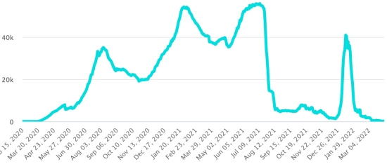 (Jour-1) Vaccination : 563,01 millions de doses de vaccin injectées depuis le 14 décembre 2020 date de la première injection aux États-Unis (+430,000 doses en 24h). Mise à jour 5 avril (dernières données disponibles). RÉPUBLIQUE DOMINICAINE : Cas confirmés depuis le 1er mars 2020 : 578,253 cas (+44 en 24h) la veille (+30 en 24h). Premier cas (1er mars 2020) Guérisons : 573,723 guérisons (+20 en 24h), la veille (+103) Taux national de Guérison : 99,21% (-) Décès : 4,375 décès (+0), précédent (+0) Taux de mortalité : 0,75% (=) Taux de positivité sur 4 semaines épidémiologiques : 0,88% (-) Cas actifs : (excluant décès et guérisons) 155 cas (+24 en 24h) la veille (-73) République Dominicaine : Tendance cas actifs : (moins guérisons et décès)