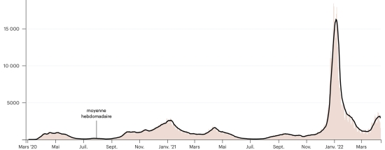 (tendance moyenne hebdomadaire) Vaccination : 18,923,834 doses de vaccin injectées depuis le 14 décembre 2020 date de la première injection (+25,602 doses en 24h), dernières données disponibles - MSSS en date du 11 avril 2022) FRANCE : *Cas confirmés depuis le premier cas (24 janvier 2020) : 27,163,629 cas (+190,762 cas en 24h), précédent (+133,146) *Guérisons : 24,344,051 guérisons (+145,401), précédent (+180,599) Taux national de Guérison : 89,62% (-) Décès : 143,625 (+159 en 24h), précédent (+178) Taux de mortalité : 0,52% (-) Cas Actifs : 2,675,953 (+45,202 en 24h), précédent (+83,475) France : Tendance cas actifs : (moins guérisons et décès)