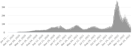SITUATION MONDIALE 2019-2022 : Situation épidémiologique : Mercredi 27 avril 2022 le nombre de personnes contaminées dans le monde par le coronavirus Covid-19 et ses variants depuis le début de la pandémie (11 mars 2020) s’élève à 510,917,840 cas (+779,795 en 24h), la veille (+525,553) Nombre de pays contaminés : 225 *Guérisons : 464,172,644 personnes ont été guéries du Covid-19 dans le monde (+723,640 en 24h), la veille (+947,240) *Décès : 6,249,337 personnes sont mortes du Covid-19 dans le monde depuis le début de la pandémie (+3,384 en 24h), la veille (+2,442) *Cas actifs (moins décès et guérisons) dans le monde est actuellement de 40,495,859 cas (+52,771 en 24h), la veille (-424,129) Taux moyen de guérison au monde : 90,85% (+) Taux moyen de mortalité au monde : 1,22% (=) Monde : Nombre de cas confirmés quotidiens :