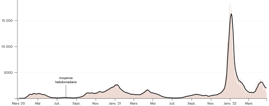 (tendance moyenne hebdomadaire) Vaccination : 19,362,099 doses de vaccin injectées depuis le 14 décembre 2020 date de la première injection (+22,303 doses en 24h), dernières données disponibles - MSSS en date du 20 avril 2022) FRANCE : *Cas confirmés depuis le premier cas (24 janvier 2020) : 28,415,413 cas (+97,498 cas en 24h), la veille (+13,984) *Guérisons : 26,245,044 guérisons (+161,780), la veille (+202,824) Taux national de Guérison : 92,36% (+) Décès : 145,427 décès (+170 en 24h), la veille (+197) Taux de mortalité : 0,51% (=) Cas Actifs : 2,024,942 (-64,452 en 24h), la veille (-189,037) France : Nombre de cas confirmés quotidiens :