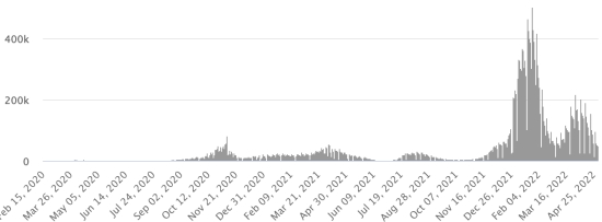 SITUATION MONDIALE 2019-2022 : Situation épidémiologique : Lundi 2 mai 2022 le nombre de personnes contaminées dans le monde par le coronavirus Covid-19 et ses variants depuis le début de la pandémie (11 mars 2020) s’élève à 513,658,032 cas (+283,535 en 24h), la veille (+419,789) Nombre de pays contaminés : 225 *Guérisons : 467,899,119 personnes ont été guéries du Covid-19 dans le monde (+514,855 en 24h), la veille (+562,626) *Décès : 6,261,894 personnes sont mortes du Covid-19 dans le monde depuis le début de la pandémie (+963 en 24h), la veille (+1,495) *Cas actifs (moins décès et guérisons) dans le monde est actuellement de 39,497,019 cas (-232,283 en 24h), la veille (-144,332) Taux moyen de guérison au monde : 91,09% (+) Taux moyen de mortalité au monde : 1,21% (=) Monde : Nombre de cas confirmés quotidiens :