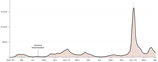 (tendance moyenne hebdomadaire) Vaccination : 19,558,471 doses de vaccin injectées depuis le 14 décembre 2020 date de la première injection (+18,659 doses en 24h), dernières données disponibles - MSSS) FRANCE : *Cas confirmés depuis le premier cas (24 janvier 2020) : 28,805,690 cas (+ 47,925 cas en 24h), la veille (+67,018) *Guérisons : 27,301,135 guérisons (+137,222 en 24h), la veille (+120) Taux national de Guérison : 94,77% (+) Décès : 146,376 décès (+114 en 24h), la veille (+120) Taux de mortalité : 0,50% (=) Cas Actifs : 1,358,179 (+89,531 en 24h), la veille (+67,017) France : Nombre de cas confirmés quotidiens :