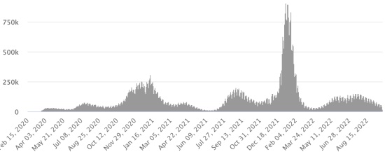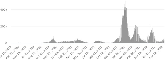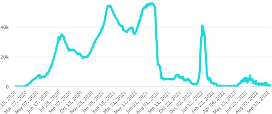 TOP 5 des Communes les plus touchées dans l’Ouest (2022) : Delmas : 1,247 (+4) ; Pétion-ville 1,113 (+1) ; Port-au-Prince 644 (+0) ; Tabarre 514 (+1) ; Croix-des-Bouquets 434 (+1) Cas confirmés par département (2022 / 2021 / 2020) : Ouest : 2022 : 4,422 (+) cas ; (2021 : 9,890) ; (2020 : 6,945 cas) Nord : 2022 : 393 (=) cas ; (2021 : 664) ; (2020 : 677 cas) Centre : 2022 : 416 (=) cas ; (2021 : 1,001) ; (2020 : 508 cas) Artibonite : 2022 : 400 (=) cas ; (2021 : 855) ; (2020 : 593 cas) Nord-Est : 2022 : 280 (=) cas ; (2021 : 404) ; (2020 : 314 cas) Sud-Est : 2022 : 384 (=) cas ; (2021 : 768) ; (2020 : 274 cas) Sud : 2022 : 330 (+) cas ; (2021 : 891) ; (2020 : 262 cas) Nord-Ouest : 2022 : 441 (+) cas ; (2021 : 383) ; (2020 : 229 cas) Grand'Anse : 2022 : 307 (=) cas ; (2021 : 861) ; (2020 : 176 cas) Nippes : 2022 : 135 (=) cas ; (2021 : 249) (2020 : 149 cas) Décès cumulés par département (2022-2021) : Ouest : 303 décès (2020 : 104 décès) Nord : 54 décès (2020 : 34 décès) Centre : 91 décès (2020 : 13 décès) Artibonite : 43 décès (2020 : 39 décès) Nord-Est : 7 décès (2020 : 6 décès) Sud : 51 décès (2020 : 6 décès) Sud-Est : 15 décès (2020 : 9 décès) Nord-Ouest : 16 décès (2020 : 12 décès) Grand'Anse : 7 décès (2020 : 13 décès) Nippes : 27 décès (2020 : 5 décès) Répartition des décès par âge (depuis le début de l’épidémie) : 0-9 ans : 16 décès 10-19 ans : 11 décès 20-29 ans : 33 décès 30-39 ans : 58 décès 40-49 ans : 82 décès 50-59 ans : 137 décès 60-69 ans : 191 décès 70-79 ans : 189 décès (+2) 80 ans et plus : 140 décès Vaccination : 361,212 haïtiens (3,11% de la population) +2,307 en 8 jours ont reçu une 1ère dose de vaccin depuis le 16 juillet 2021 date de la première injection à travers 149 centres de vaccinations ouverts et 222,303 haïtiens sont entièrement vaccinés (2 doses, 1,91% de la population) +658 en 8 jours. Mise à jour 20 septembre 2022 dernières informations disponibles (source MSPP). Liste des 149 Centres de vaccination ouverts en Haïti (et horaires) par département : (mise à jour 20 octobre 2021, dernières informations disponibles) DIASPORA : Situation épidémiologique : USA : *Cas depuis le premier cas (29 février 2020) : 97,905,915 cas (+10,055 en 24h), précédent (+15,409 en 24h) *Guérisons : 94,590,350 guérisons (+60,350 en 24h), précédent (+85,910 en 24h) Taux national de Guérison : 96,61% (+) *Décès : 1,081,715 décès (+7 en 24h), précédent (+142 en 24h) Taux de mortalité : 1,10% (=) *Cas actifs (moins décès et guérisons) : 2,233,850 cas (-50,302 en 24h), précédent (+70,643 en 24h) USA : Nombre de cas confirmés quotidiens :