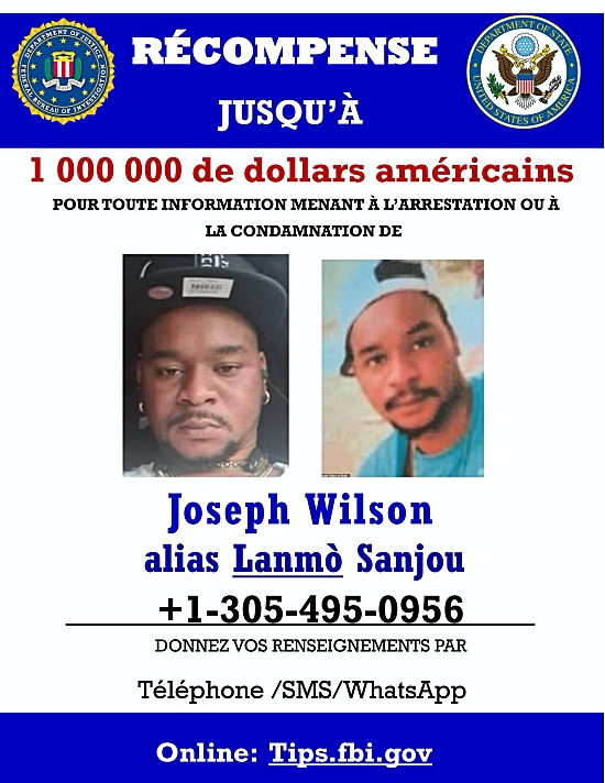 Le Département de la Justice américaine a publié des informations permettant d’identifier l’un des Chefs de gang de « 400 Mawozo » Joseph Wilson alias « Lanmò Sanjou » activement recherché. Dans le cadre du Programme de récompenses contre le crime organisé transnational, le Département d'État des États-Unis offre JUSQU'À 1 MILLION DE DOLLARS pour toute information menant à l'arrestation et/ou à la condamnation de Joseph Wilson et explique comment procéder pour communiquer vos informations sur cet individu. Nom : Joseph Wilson Alias : Lanmò Sanjou, Lanmò San Jou, Lamò Sanjou Date de naissance : 28 Février 1993 Pays : Haïti Nationalité : Haïtienne Citoyenneté : Haïtienne Hauteur : Inconnue Poids : Inconnu Couleur des cheveux : Noire Couleur des yeux : Brune Cicatrices, tatouages ou marques distinctives : Mollet droit : crâne ; Mollet gauche : serpent ; Avant-bras droit : couteau ; Épaule droite : toile d'araignée ; Bras gauche : écriture cursive, gainée ; Poitrine : étoiles, écriture cursive. Joseph Wilson a été identifié comme l'un des dirigeants qui aurait été impliqué dans le complot du 16 octobre 2021 https://www.haitilibre.com/article-35012-haiti-flash-au-moins-une-quinzaine-de-missionnaires-americains-enleves-a-port-au-prince.html visant à kidnapper 16 missionnaires chrétiens américains et un missionnaire canadien et à les retenir contre rançon. Au moment de leur enlèvement, les victimes circulaient en bus sur une voie publique passant par la Croix-des-Bouquets. Les victimes d'enlèvement du groupe de missionnaires comprenaient 12 adultes âgés de 18 à 48 ans, et 5 enfants âgés de 8 mois, 3, 6, 13 et 15 ans. Pendant l'enlèvement, Sanjou s'est entretenu avec d'autres chefs du gang des 400 Mawozo, dont le fondateur du gang Joly Germine et se sont mis d'accord sur les conditions de paiement de la rançon. Sanjou a également régulièrement appelé des représentants des otages pour exiger le paiement d'une rançon. En juillet 2022, Sanjou a été inculpé de 16 chefs d'accusation de prise d'otage (un pour chaque citoyen américain victime) et d'un chef d'accusation de complot en vue de commettre une prise d'otage, en violation de la loi 18 U.S.C. 1203(a) et 2.