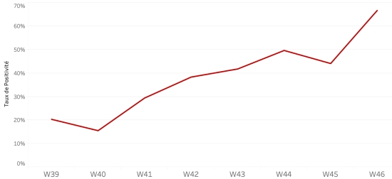 Situation du choléra en Haïti : Bilan partiel du choléra en Haïti selon les données de la Direction d’Épidémiologie, des Laboratoires et de la Recherche du Ministère de la Santé publique. 19 novembre 2022 :(dernières données disponibles) Données calculées depuis le premier cas confirmé (3 octobre 2022) Total des cas suspects : 10,416 cas +313 (+3,09%) en 24h (la veille : +421 cas en 24h) Total des cas confirmés : 843 cas +0 (+0%) en 24h, (la veille : +0 cas en 24h) ** Total des cas suspects hospitalisés : 9,097 cas +287 (+3.25%) en 24h, (la veille +360 en 24h) Total des décès : 187 décès (125 institutionnels et 62 communautaires) +3 décès (+1,16%) en 24h, (la veille : +8 décès en 24h). ** :Depuis 2 jours aucun test n’a été réalisé (ou données mises à jour) ce qui fait que le nombre de cas confirmés demeure inchangé alors que le choléra progresse toujours… Taux de positivité hebdomadaire :