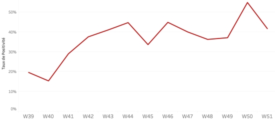 22 décembre 2022 : (dernières données disponibles) Données calculées depuis le premier cas confirmé (3 octobre 2022) Total des cas suspects : 19,247 cas +448 (+2,38%) en 24h (précédent : +330 en 24h ) Total des cas confirmés : 1,407 cas +27 (1,9%) en 24h, (précédent : +0** en 24h) Total des cas suspects hospitalisés : 16,456 cas +409 (+2,54%) en 24h, (précédent +333 en 24h) Total des décès : 355 décès (225 institutionnels et 117 communautaires) +13 décès (+5,55%) en 24h, (précédent : +18 décès en 24h). **aucun résultat de nouveaux tests publié Bilan partiel du choléra en Haïti selon les données de la Direction d’Épidémiologie, des Laboratoires et de la Recherche du Ministère de la Santé publique Taux de positivité hebdomadaire :