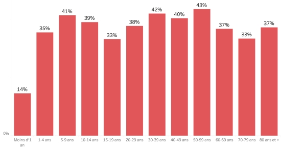 Répartition et écarts des cas suspects, total depuis le 3 octobre (en 24h) : Moins d’1 an : +344 (+10) 1-4 ans : 3,702 cas (+110) 5-9 ans : 2,725 cas (+100) 10-14 ans : 1,321 cas (+27) 15-19 ans : 970 cas (+19) 20-29 ans : 2,829 cas (+48) 30-39 ans : 2,698 cas (+40) 40-49 ans : 1,839 cas (+35) 50-59 ans : 1,303 cas (+23) 60-69 ans : 820 cas (+22) 70-79 ans : 419 cas (+11) 80 et + 35 cas (+1) Hommes : 57,64% d’hommes (-) ; Femmes 42,36% (+) Taux de positivité par segment d’âge :