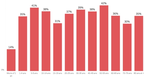 11 janvier 2023: (dernières données disponibles) Données calculées depuis le premier cas confirmé (3 octobre 2022) Total des cas suspects : 24,164 cas +335 (+1,40%) en 24h (la veille : +224 en 24h ) Total des cas confirmés : 1,663 cas +21 (1,27%) en 24h (précédent :+31 en 24h). Total des cas suspects hospitalisés : 20,172 cas +303 (+1,52%) en 24h, (la veille +220 en 24h) Total des décès : 474 décès ((293 institutionnels (+7) et 179 communautaires (+1)) +8 décès (1,7%) en 24h, (la veille : +2 décès). Bilan partiel du choléra en Haïti selon les données de la Direction d’Épidémiologie, des Laboratoires et de la Recherche du Ministère de la Santé publique Taux de positivité hebdomadaire : Des difficultés ne permettent pas au MSPP de générer un graphique 2023 exploitable. Répartition et écarts des cas suspects, total depuis le 3 octobre (en 24h) : Moins d’1 an : +431 (+8) 1-4 ans : 4,699 cas (+86) 5-9 ans : 3,375 cas (+55) 10-14 ans : 1,601 cas (+33) 15-19 ans : 1,196 cas (+17) 20-29 ans : 3,345 cas (+40) 30-39 ans : 3,097 cas (+33) 40-49 ans : 2,153 cas (+11) 50-59 ans : 1,577 cas (+23) 60-69 ans :1,016 cas (+15) 70-79 ans : 528 cas (+14) 80 et + : 91 cas (non disponible) Hommes : 56,68% d’hommes (-) ; Femmes 43,32% (+) Taux de positivité par segment d’âge :