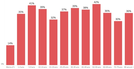 12 janvier 2023: (dernières données disponibles) Données calculées depuis le premier cas confirmé (3 octobre 2022) Total des cas suspects : 24,216 cas +52 (+0,21%) en 24h (la veille : +335 en 24h ) Total des cas confirmés : 1,702 cas +39 (2,34%) en 24h (précédent :+21 en 24h). Total des cas suspects hospitalisés : 20,218 cas +46 (+0,22%) en 24h, (la veille +303 en 24h) Total des décès : 479 décès ((293 institutionnels (+4) et 179 communautaires (+1)) +5 décès (1,05%) en 24h, (la veille : +8 décès). Bilan partiel du choléra en Haïti selon les données de la Direction d’Épidémiologie, des Laboratoires et de la Recherche du Ministère de la Santé publique Taux de positivité hebdomadaire : Des difficultés ne permettent pas au MSPP de générer un graphique 2023 exploitable. Répartition et écarts des cas suspects, total depuis le 3 octobre (en 24h) : Moins d’1 an : +431 (+0) 1-4 ans : 4,716 cas (+17) 5-9 ans : 3,390 cas (+15) 10-14 ans : 1,604 cas (+3) 15-19 ans : 1,199 cas (+3) 20-29 ans : 3,351 cas (+6) 30-39 ans : 3,100 cas (+3) 40-49 ans : 2,156 cas (+3) 50-59 ans : 1,578 cas (+1) 60-69 ans :1,016 cas (+0) 70-79 ans : 529 cas (+1) 80 et + : 91 cas (non disponible) Hommes : 56,67% d’hommes (-) ; Femmes 43,33% (+) Taux de positivité par segment d’âge :