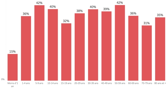 15 janvier 2023: (dernières données disponibles) Données calculées depuis le premier cas confirmé (3 octobre 2022) Total des cas suspects : 24,566 cas +30 (+0,12%) en 24h (la veille : +320 en 24h ) Total des cas confirmés : 1,783 cas +41 (2,35%) en 24h (précédent :+40 en 24h). Total des cas suspects hospitalisés : 20,536 cas +31 (+0,15%) en 24h, (la veille +287 en 24h) Total des décès : 490 décès ((303 institutionnels (+0) et 180 communautaires (+0)) +0 décès (%) en 24h, (la veille : +11 décès). Bilan partiel du choléra en Haïti selon les données de la Direction d’Épidémiologie, des Laboratoires et de la Recherche du Ministère de la Santé publique Taux de positivité hebdomadaire : Le MSPP n’est pas en mesure de générer correctement le graphique 2023. Répartition et écarts des cas suspects, total depuis le 3 octobre (en 24h) : Moins d’1 an : +435 (+1) 1-4 ans : 4,796 cas (+7) 5-9 ans : 3.446 cas (+5) 10-14 ans : 1,629 cas (+0) 15-19 ans : 1,224 cas (+0) 20-29 ans : 3,418 cas (+5) 30-39 ans : 3,136 cas (+4) 40-49 ans : 2,180 cas (+1) 50-59 ans : 1,595 cas (+6) 60-69 ans :1,024 cas (+1) 70-79 ans : 534 cas (+1) 80 et + : 95 cas (+0) Hommes : 56,65% d’hommes (-) ; Femmes 43,35% (+) Taux de positivité par segment d’âge :
