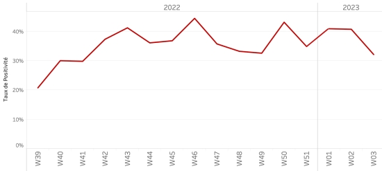 24 janvier 2023: (dernières données disponibles) Données calculées depuis le premier cas confirmé (3 octobre 2022) Total des cas suspects : 26,756 cas +494 (+2,62%) en 24h (précédent : + 301 en 24h) Total des cas confirmés : 2,016 cas +78 (0,40%) en 24h (précédent :+0 en 24h). Total des cas suspects et confirmés hospitalisés : 22,554 cas +559 (+2,54%) en 24h, (précédent +299 en 24h) Total des décès : 517 décès ((312 institutionnels (+10) et 184 communautaires (+5)) +non disponible (+0%) en 24h, (précédent : +15). Bilan partiel du choléra en Haïti selon les données de la Direction d’Épidémiologie, des Laboratoires et de la Recherche du Ministère de la Santé publique et de la Population (MSPP) Taux de positivité hebdomadaire :