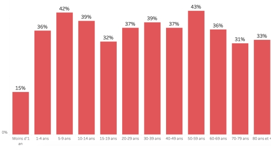 Répartition et écarts des cas suspects, total depuis le 3 octobre (en 24h) : Moins d’1 an : + 477 (+17) 1-4 ans : 5,270 cas (+40) 5-9 ans : 3,813 cas (+78) 10-14 ans : 1,770 cas (+49) 15-19 ans : 1,342 cas (+28) 20-29 ans : 3,711 cas (+93) 30-39 ans : 3,337 cas (+51) 40-49 ans : 2,354 cas (+45) 50-59 ans : 1,744 cas (+42) 60-69 ans :1,141 cas (+26) 70-79 ans : 598 cas (+25) 80 ans et + : 98 cas cas (non disponible) Hommes : 56,49% d’hommes (=) ; Femmes 43,51% (=) Taux de positivité par segment d’âge :