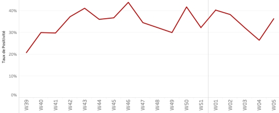 6 février 2023: (dernières données disponibles) Données calculées depuis le premier cas confirmé (3 octobre 2022) Total des cas suspects : 30,539 cas +77 en 24h (+0,25%), la veille +364 en 24h Total des cas confirmés : 2,107 cas +0* en 24h (%), la veille +0* en 24h Total des cas suspects et confirmés hospitalisés : 26,107 cas +74 en 24h (+0,28%), la veille +341 en 24h Total des décès : 560** décès ((365 institutionnels (+0) et 195 communautaires (+0)) +0 en 24h (%), précédent : +0 en 24h * Aucun résultat de test disponible depuis 3 jours ** Pas mis à jour depuis 4 jours Bilan partiel du choléra en Haïti selon les données de la Direction d’Épidémiologie, des Laboratoires et de la Recherche du Ministère de la Santé publique et de la Population (MSPP). Taux de positivité hebdomadaire :