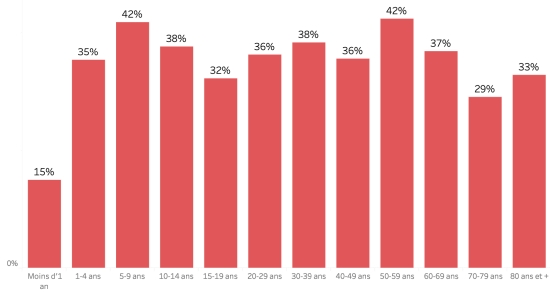 Répartition et écarts des cas suspects, total depuis le 3 octobre : Moins d’1 an : + 562 (+4) 1-4 ans : 6,125 cas (19) 5-9 ans : 4,515 cas (+16) 10-14 ans : 2,130 cas (+6) 15-19 ans : 1,572 cas (+11) 20-29 ans : 4,161 cas (+5) 30-39 ans : 3,671 cas (+8) 40-49 ans : 2,626 cas (+4) 50-59 ans : 1,966 cas (+2) 60-69 ans : 1,302 cas (+1) 70-79 ans :710 cas (+1) 80 ans et + : 98 cas cas (non disponible) Hommes : 55,87% d’hommes (-) ; Femmes 44,13% (+) Taux de positivité par segment d’âge :