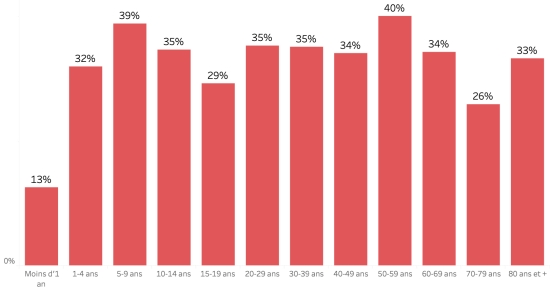 23 avril 2023 : (dernières données disponibles, précédent bulletin du Ministère 22 avril 2023 https://www.haitilibre.com/article-39443-haiti-cholera-bulletin-quotidien-166.html ) Données calculées depuis le premier cas confirmé (3 octobre 2022) Total des cas suspects : 40,876 cas +22 en 24h, la veille +56 en 24h Total des cas confirmés : 2,677* cas +0, la veille +0 en 24h Total des cas hospitalisés (suspects et confirmés) : 35,350 cas +22 cas en 24h, la veille +32 en 24h Total des décès : 672 décès ((448 institutionnels (+0) et 224 communautaires (+0)) +2, précédent +0 *Aucun résultat de test publié par le Laboratoires du MSPP depuis 4 jours Bilan partiel du choléra en Haïti selon les données de la Direction d’Épidémiologie, des Laboratoires et de la Recherche du Ministère de la Santé publique et de la Population (MSPP). Répartition et écarts des cas suspects, total depuis le 3 octobre : (Partiel et incomplet) Moins d’1 an : + 941 (+0) 1-4 ans : 8,311 cas (+2) 5-9 ans : 5,935 cas (+2) 10-14 ans : 2,967 cas (+3) 15-19 ans : 2,141 cas (+3) 20-29 ans : 5,336 cas (+2) 30-39 ans : 4,581 cas (+3) 40-49 ans : 3,366 cas (+2) 50-59 ans : 2,561 cas (+1) 60-69 ans : 1,800 cas (+2) 70-79 ans : 1,033 cas (+2) Hommes : 54,82% d’hommes (=) ; Femmes 45,17 (=) Taux de positivité par segment d’âge :