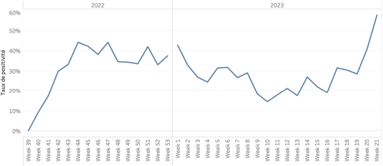 Nombre de tests réalisés : 8,541* +0 en 24h, précédent +0 en 24h Taux de positivité : 34,98%, précédent 34,98% *Information non actualisée depuis 4 jours Il est a noter que le pourcentage de 34,66% du taux de cas positifs sur les tests réalisés est bien inférieur au graphique publié le même jour par le Ministère, qui indique un taux de positivité moyen proche de 60% pour la semaine épidémiologique #21 Évolution du taux de positivité :