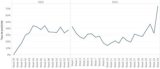 Nombre de tests réalisés : 8,774 +80 en 24h, précédent +0 en 24h Taux de positivité : 35,05%, précédent 34,78% Évolution du taux de positivité :