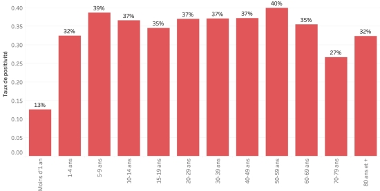 Nombre de tests réalisés : 9,670 +59 en 48h, précédent +8 en 24h Taux de positivité : 35,69%, précédent 35,64% Évolution hebdomadaire du taux de positivité (semaine 27) :