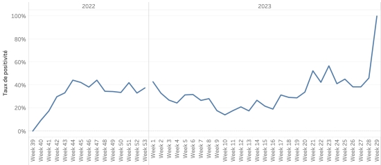 Nombre de tests réalisés : 10,025* +0 en 24h, précédent +0 en 24h Taux de positivité (moyen depuis le débit de l’épidémie) : 35,74%, précédent 35,74% *Non actualisé depuis 2 jours. Évolution hebdomadaire du taux de positivité (semaine 29) :